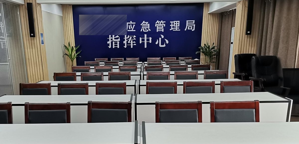 应急指挥中心由于面积大、要求会议发言声音清晰,采用10-12寸全频音箱6只,均匀分布在会场四周,保证会场声压级均匀;由于会商室面积较小,配置4只网络音柱;同时保证两区域间音频互通,配置XW-MT1616音频处理器调试音频,通过分布式节点网络传输的方式进行多点位交互。