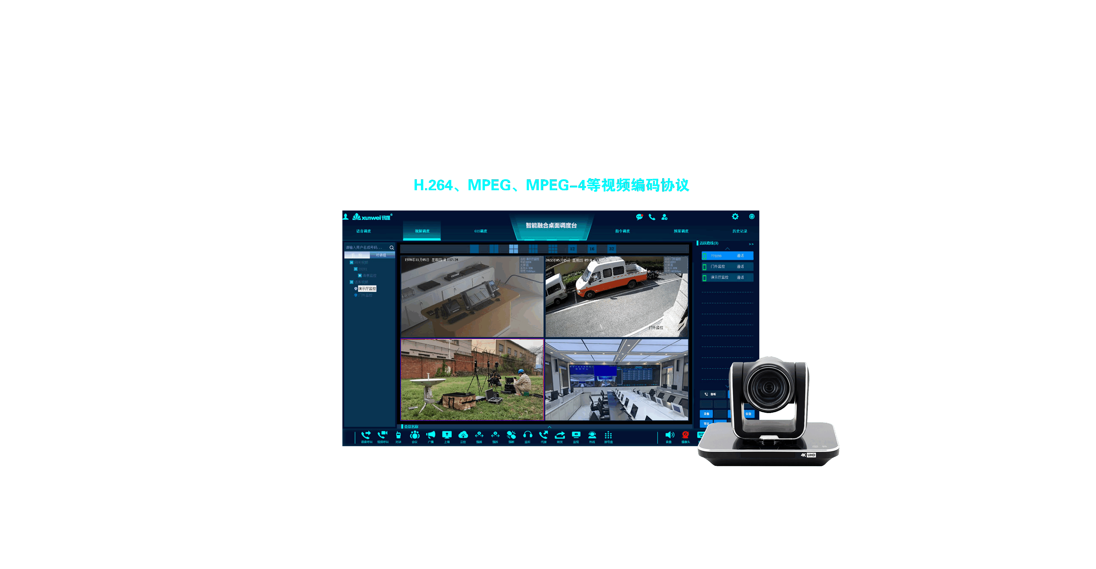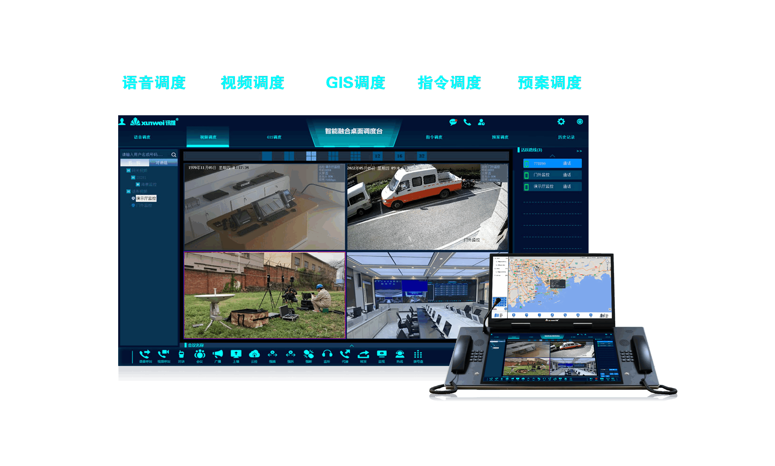 专业可视化调度操作界面,通过一张GIS电子地图可完成可视电话、可视对讲、可视广播、视频会商和远程可视化控制等操作,支持语音调度、视频调度、GIS调度、指令调度、预案调度五种调度模式。