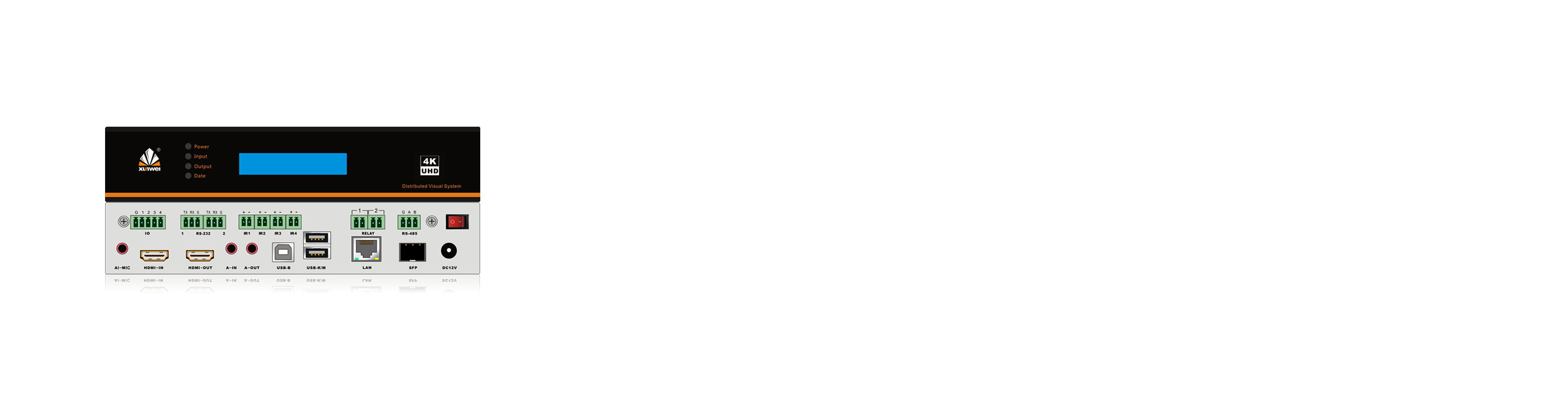 视频输入:1路HDMI 视频环出:1路HDMI输出,1路HDMI环出 音频输入:1路3.5mm立体声 音频输出:1路3.5mm立体声 中控接口:2路RS232口,4路红外口,4路IO口,1路RS485口,2路继电器口 最大分辨率:3840*2160P@30Hz,向下兼容 规格:220mm(长)x160mm(宽)x44mm(高) 重量:约1kg