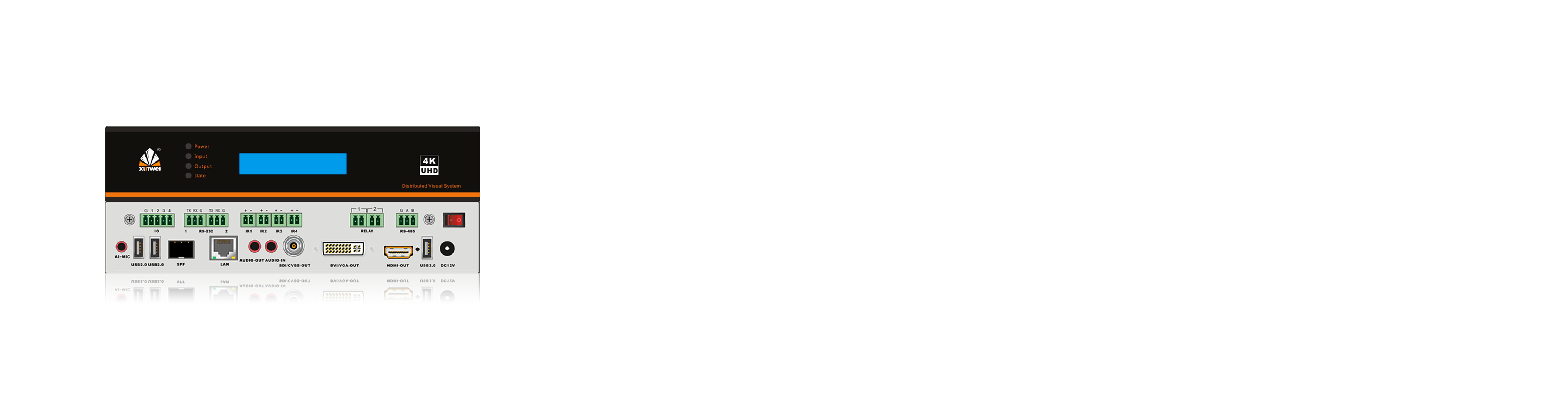视频输出:1路HDMI、1路DVI/VGA、1路CVBS 音频输入:1路3.5mm立体声 音频输出:1路3.5mm立体声 中控接口:2路RS232口,4路红外口,4路IO口,1路RS485口,2路继电器口 最大分辨率:3840*2160P@30Hz,向下兼容 规格:220mm(长)x160mm(宽)x44mm(高) 重量:约1kg
