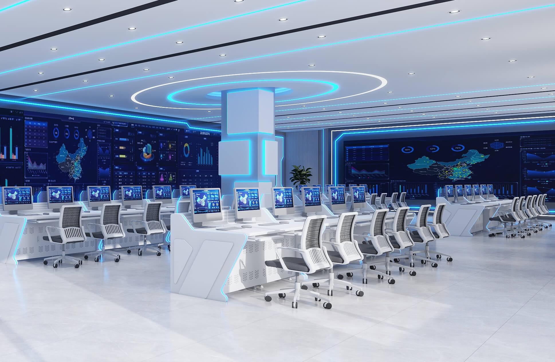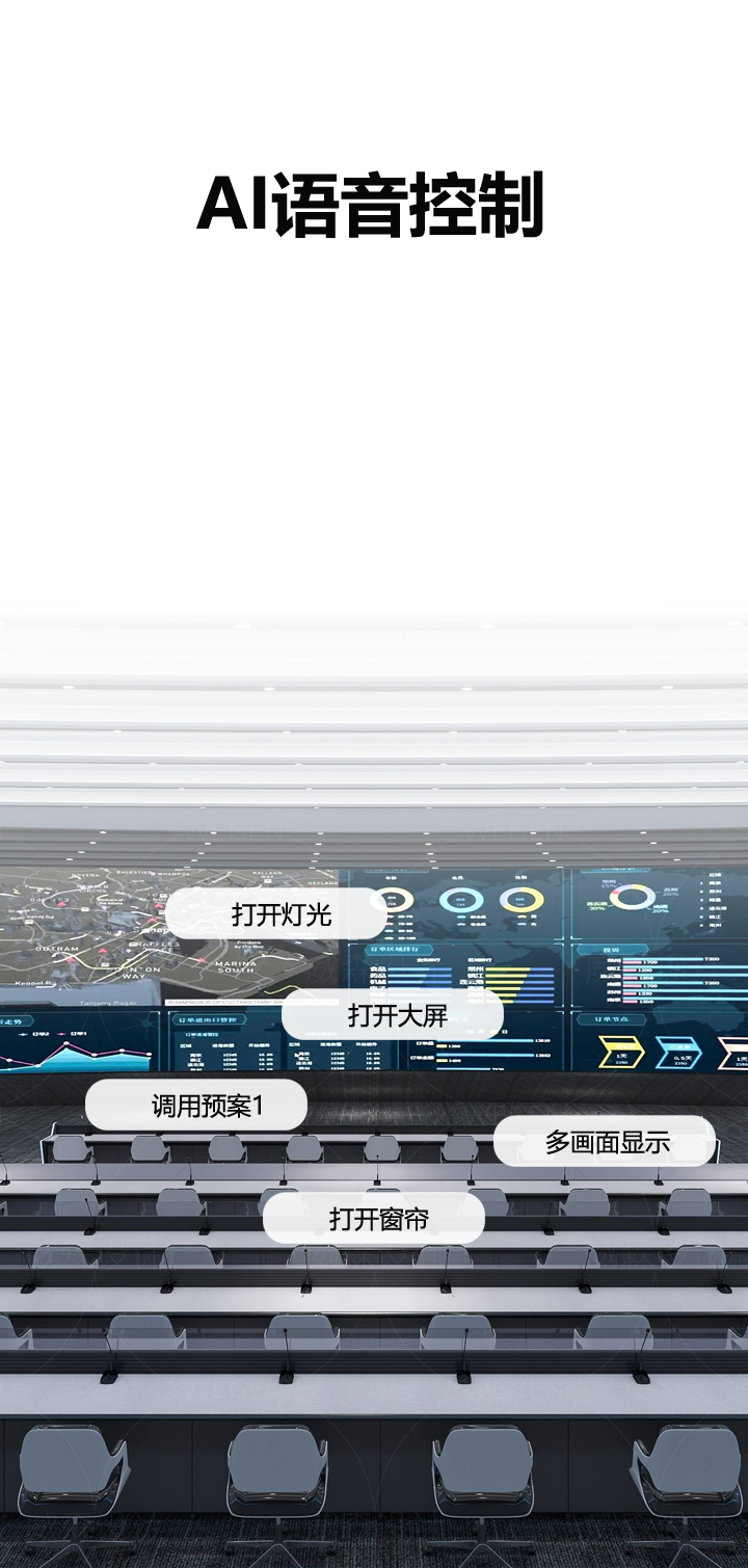 可根据指挥中心实景进行1:1高精度3D复刻建模,通过web端软件界面用鼠标、语音、触控等方式实现对现场音视频、环境(灯光、电源、温度)等进行身临其境的可视化控制体验