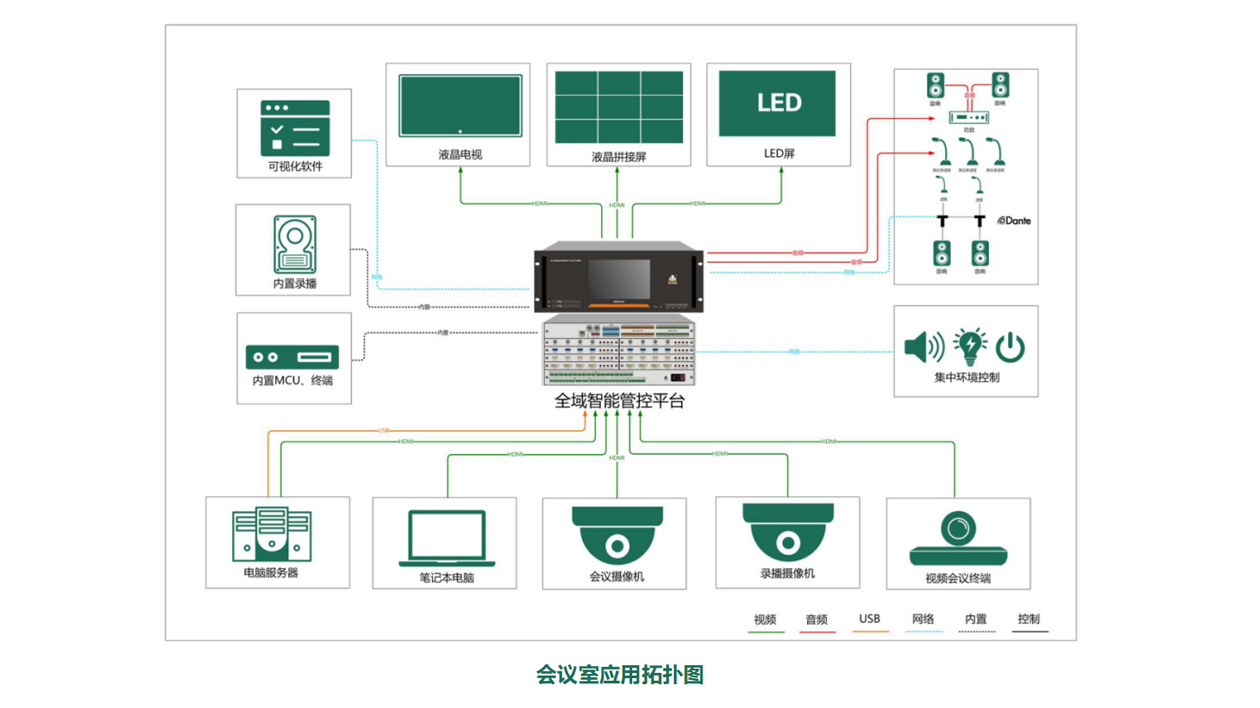 全域方案:集成高清视频拼接、数字音频处理、会议讨论、KVM坐席、中控、录播等功能于一体,通过单台主机实现统一管控,降低操作门槛。