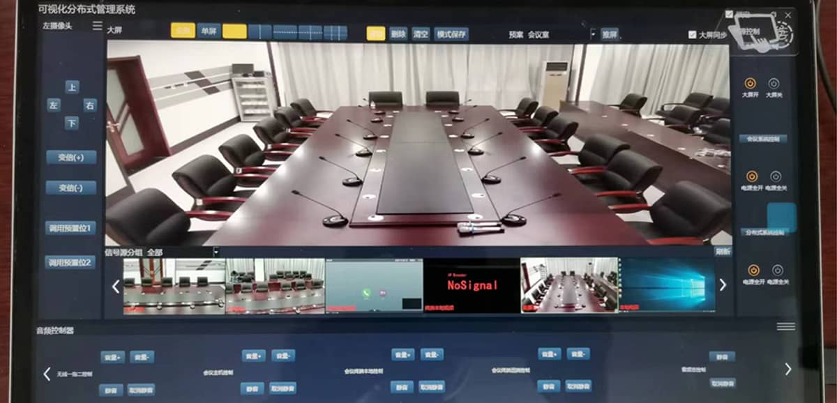 远程视频控制:管控中心可远程对各个会议室音视频信号源进行远程控制,统一调度视频画面。