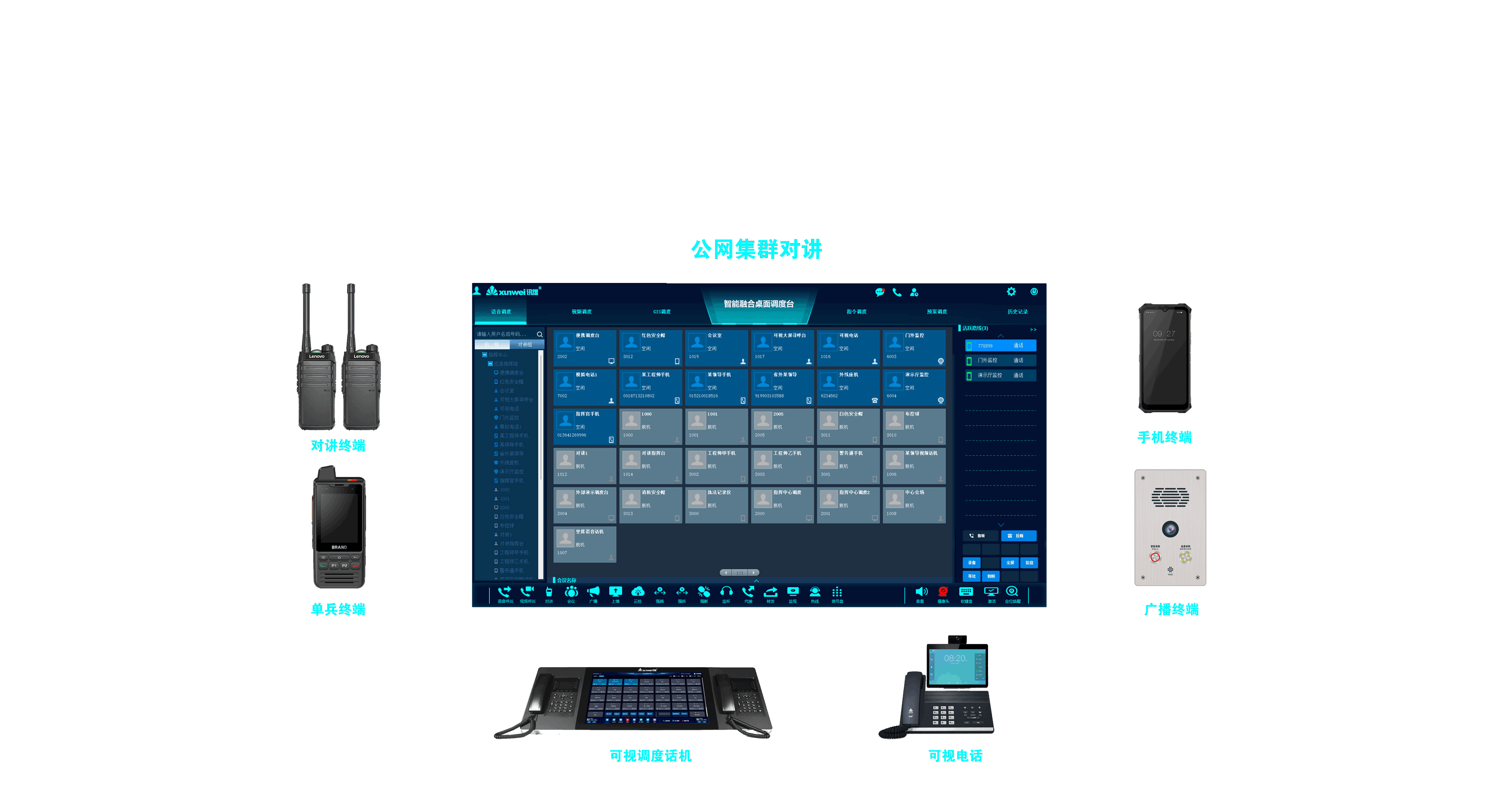 支持广播终端、网络电话、手机终端、对讲机终端、智能单兵终端等设备接入,通过融合集中调度,实现个各终端间的公网集群对讲功能,包括单呼,组呼,会议,SOS,临时组等多种对接模式。