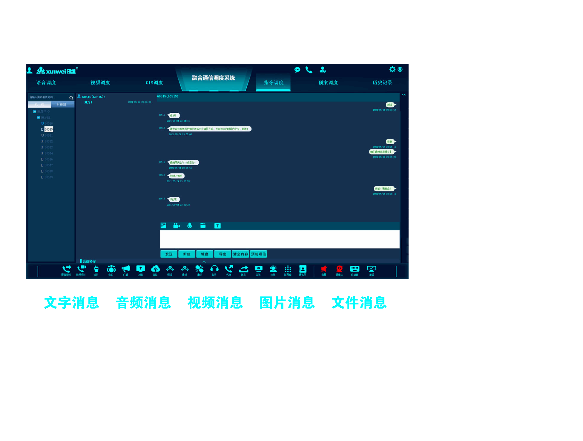 专业可视化调度操作界面,通过一张GIS电子地图可完成可视电话、可视对讲、可视广播、视频会商和远程可视化控制等操作,支持语音调度、视频调度、GIS调度、指令调度、预案调度五种调度模式。