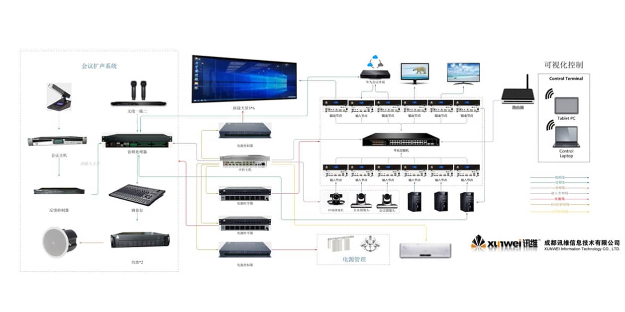 分布式系统:分布式系统结构简单,便于实施布线,可以快速部署提高施工效率。另外分布式系统集成了音频视频信号的传输和切换功能,视频拼接上墙功能,中央集中控制功能。