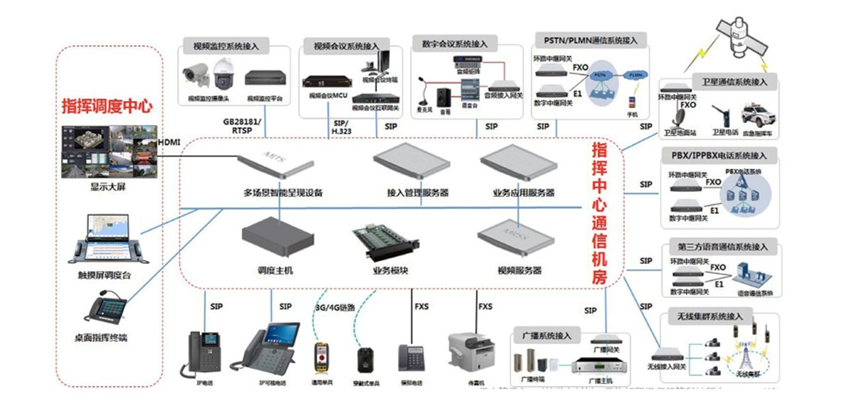 本次建设在指挥中心机房部署调度主机、视频会议主机、监控视频接入网关、语音接入网关、对讲接入网关、调度台等设备,为指挥中心提供音视频多媒体调度、录音录像、GIS调度、APP调度等业务功能的提供基础支撑。