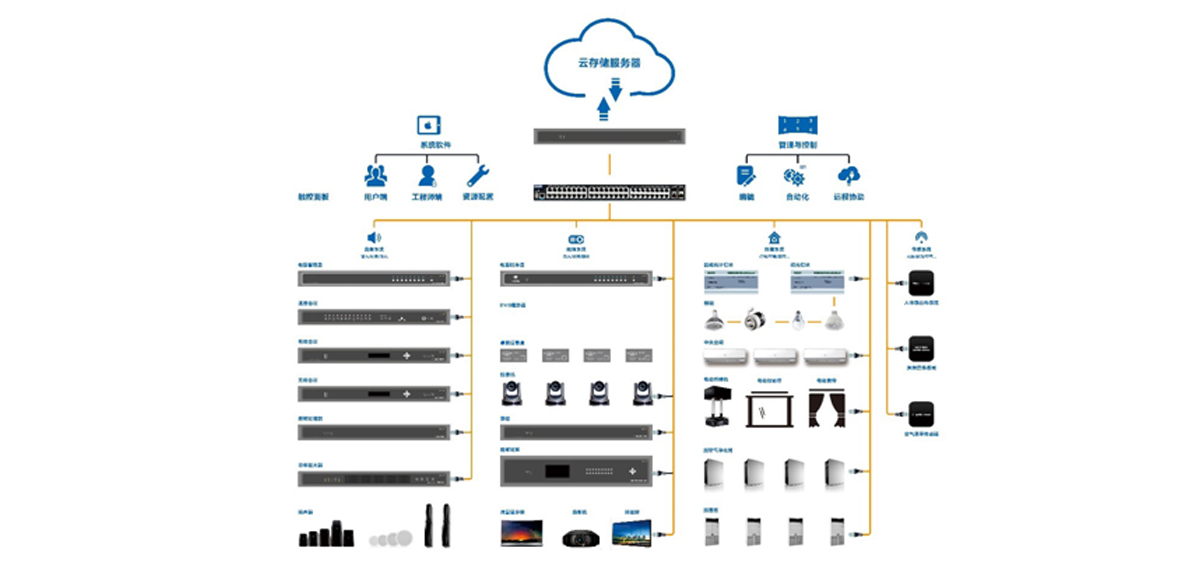 1.红外线控制模块;2.空气质量传感器;3.中央空调机组网关;4.风机盘管网关;5.空调控制墙面屏;6.摄像机;7.智能照明开关模块;8.LED控制器;9.无纸化系统;10.智能云台摄像机;11.智能插座;12.智能照明灯;13.温湿度传感器;14.网关;15.路由器;16.音箱;17.无线话筒;18.调音台;19.功放。