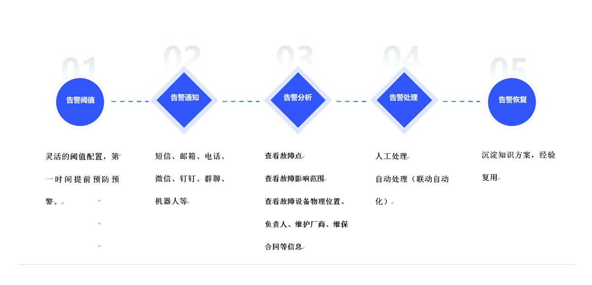 事前:灵活的告警通知,第一时间掌握故障信息;短信、邮箱、电话、微信、钉钉、群聊、机器人等通知方式;告警响应机制+故障升级机制,告警无遗漏;移动运维,第一时间掌握故障信息。