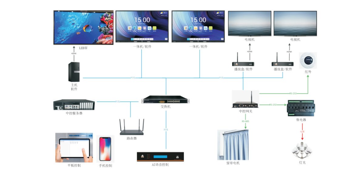 本方案采用中控服务器+播放软件+统一播放盒+控制平板+AI语音盒子组合系统设计,所有素材包括视频、图片、PPT、网页、网络视频流等全部上传货网络到达服务器,播放软件、播放盒配置服务器地址实现素材下发等功能,通过中控网关实现协议转发控制灯光、窗帘、电视机开机、屏幕开关、网络唤醒等等,通过服务器设计控制页面,由平板连接到服务器获取控制页面,实现控制,AI语音盒子网络到达服务器实现AI控制。