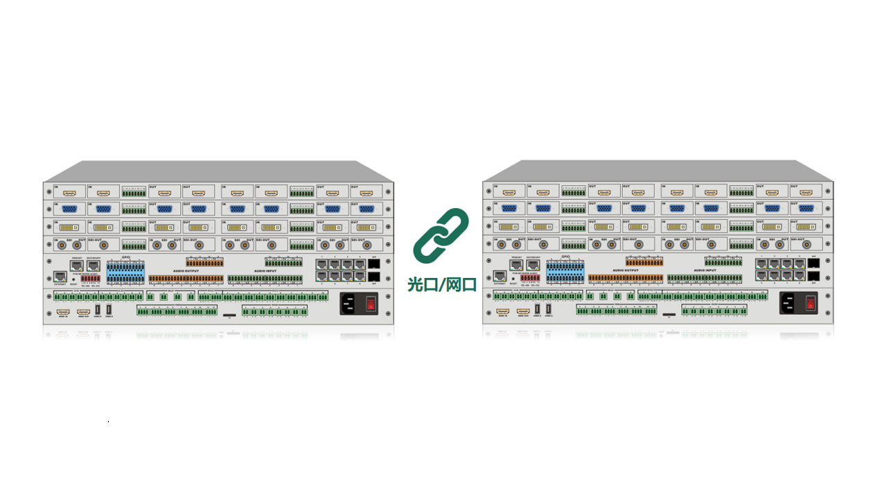 灵活扩展性:板卡选配灵活,单卡支持2进2出视频,支持混插,满足不同规模会议室需求。