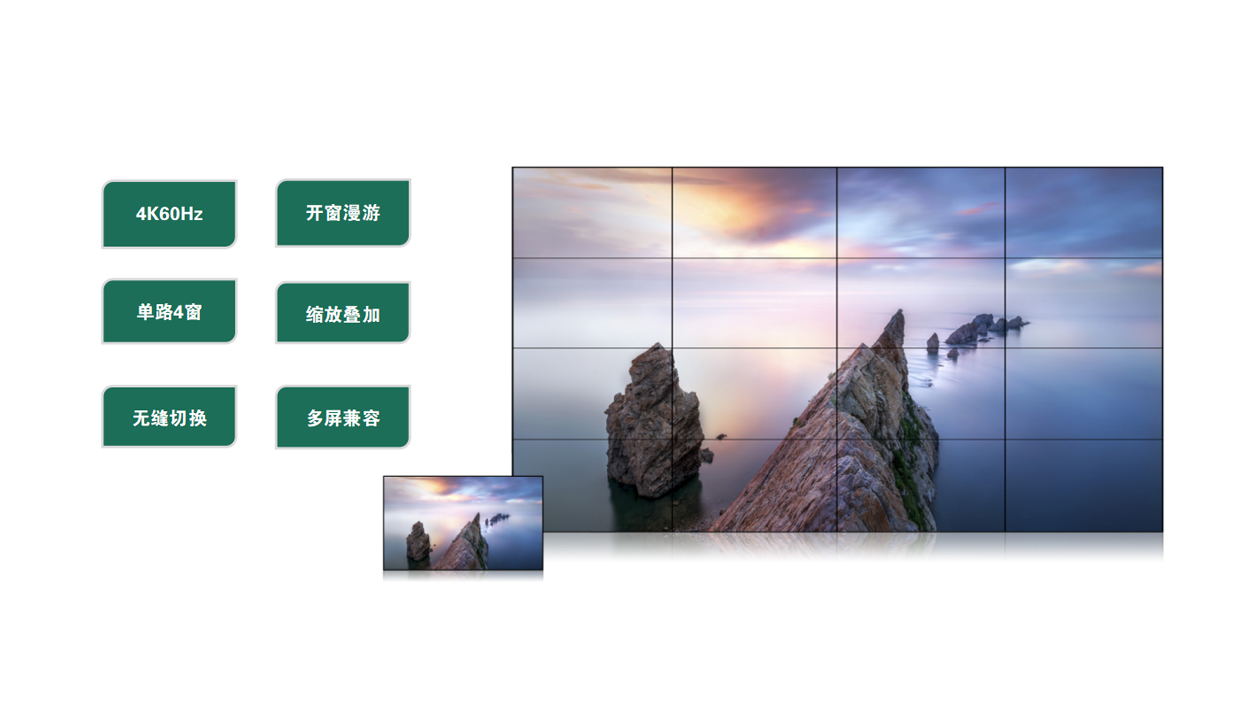 · 多屏兼容:支持液晶屏、LED屏拼接,单路最大4窗,实现多信号同步展示(如地图、监控画面、会议视频)。